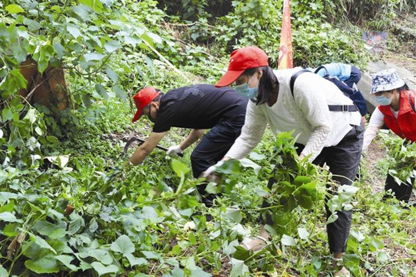 8月25日,西陵区镇镜山小学的老师在社区积极参加义务劳动,清理垃圾死角、违规菜地、野广告等。 记者王昌明 通讯员侯秀英 摄