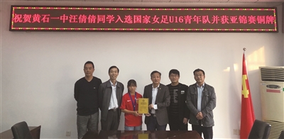 高三(9)班汪倩倩同学入选国家女足青年队,成为2019年唯一入选的湖北球员,并代表中国出战亚洲U16女足锦标赛获得季军。