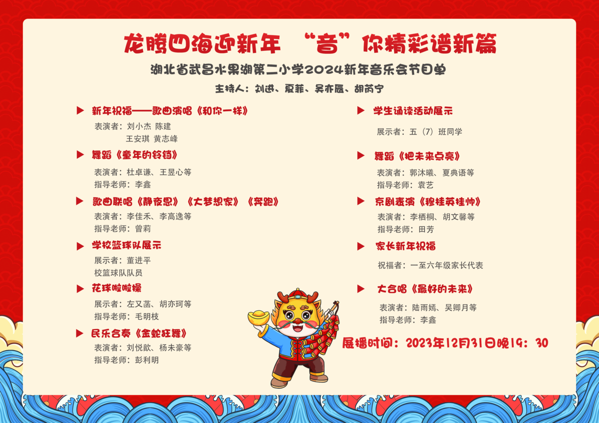 琴瑟和鸣辞旧岁,弦歌不辍迎新年!为搭建师生展示自我风采的舞台,用音符承载对新一年的期许,喜迎2024年元旦佳节的到来,2023年12月31日晚上,湖北省武昌水果湖第二小学全网直播“龙腾四海迎新年 ‘音’你精彩谱新篇” 2024新年音乐会。