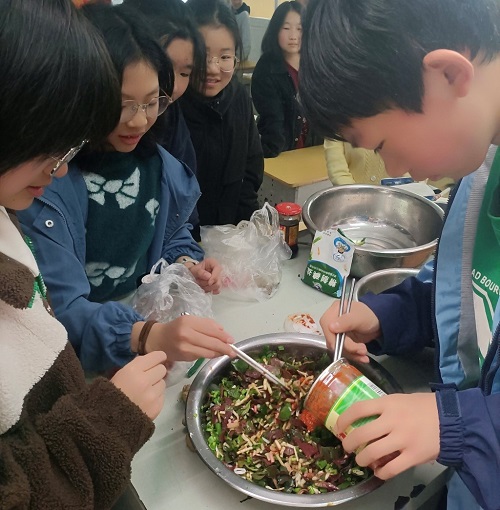 在老师示范下,同学们兴致勃勃地学习了两道美味凉菜——“凉拌鱼腥草”和“凉拌香菜”。吃到自己亲手做的菜,同学们心里美滋滋的。(鹤峰县下坪乡民族中心学校 葛赟赟)