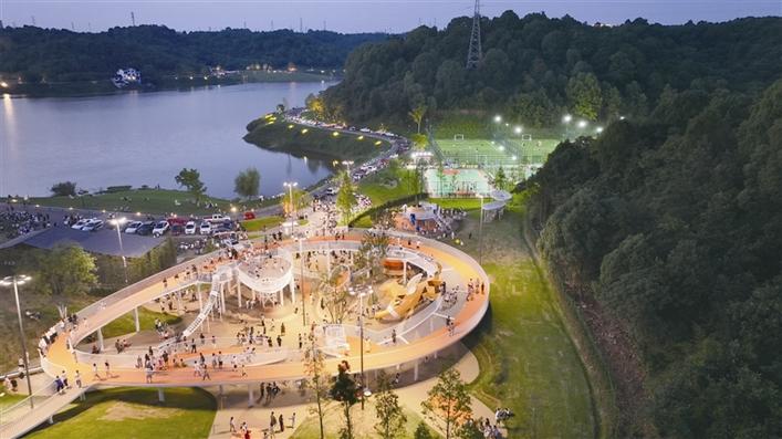 从野林子、低洼地,到高颜值、多功能。六泉湖体育公园占地约10万平方米,于2022年8月开工建设,2022年12月完成环湖健身步道、沿线生态修复和运动场等主体内容,去年8月完成夜景灯光亮化、沿线房屋外立面及环境整治等,形成了以六泉湖市民广场、六眼冲水库、六泉湖森林为基础的中央绿心休闲空间,为市民休闲运动提供了良好的场所。