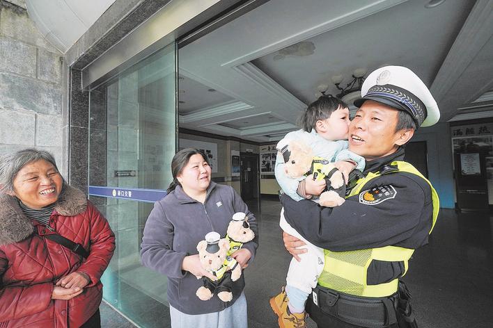 “感谢人民好交警,危急时刻伸援手”,2月24日上午,武汉市公安局硚口区交通大队,黄女士一家将一面锦旗交到辅警韩靖手中,感谢他对孩子的救命之恩。病愈的“小小田”也和家人一起来了,韩靖特地准备了交警小熊玩偶送给他。“小小田”开心极了,在韩靖脸上连亲了几口。2月13日傍晚,黄女士一家在送孩子就医途中遭遇堵车,多亏韩靖抱着昏迷男童狂奔500米,及时送到医院。(楚天都市报极目新闻记者邹斌 叶文波摄影报道)