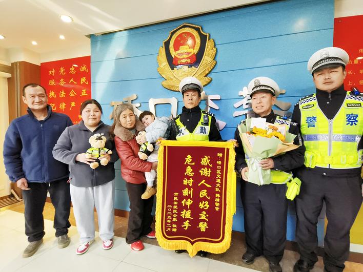 2月24日上午9时许,黄女士和公公、婆婆以及小孩来到硚口区交通大队。见到韩靖,孩子爷爷田爹爹不停鞠躬,黄女士向韩靖送上鲜花,田爹爹向韩靖送上锦旗,上面写着:“感谢人民好交警,危急时刻伸援手。”韩靖则向小孩送上“交警小熊”小礼物。小宝贝起初还有些认生,没一会儿就和韩靖熟络起来,在奶奶、妈妈的引导下,奶声奶气地向韩靖说道:“叔叔,谢谢你!”还冲着韩靖的脸颊亲吻起来,现场顿时被小宝贝萌化了。