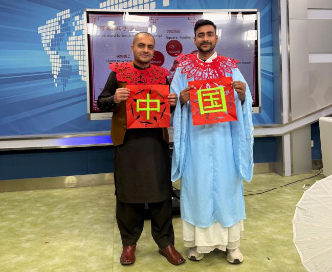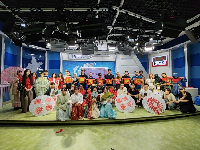 活动现场,留学生们身着云肩刺绣汉服,手持支架拍摄国风大片,刺绣纹样与剪纸图腾在光影中交融,传统与现代元素在欢笑中共舞。