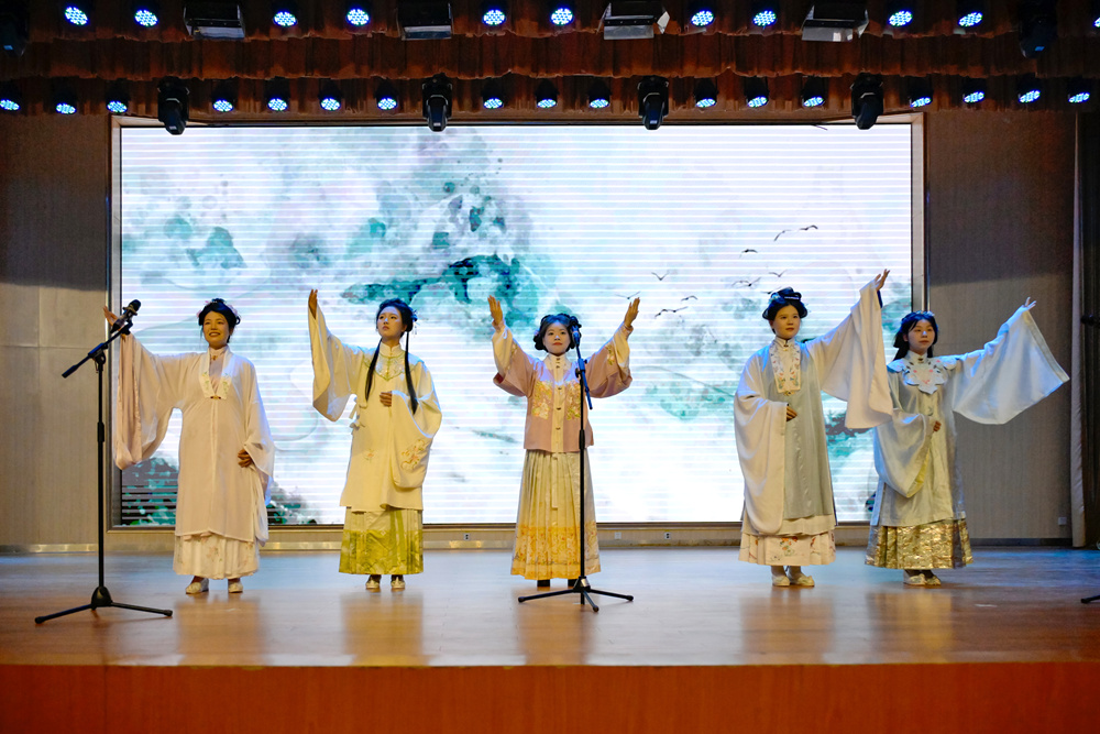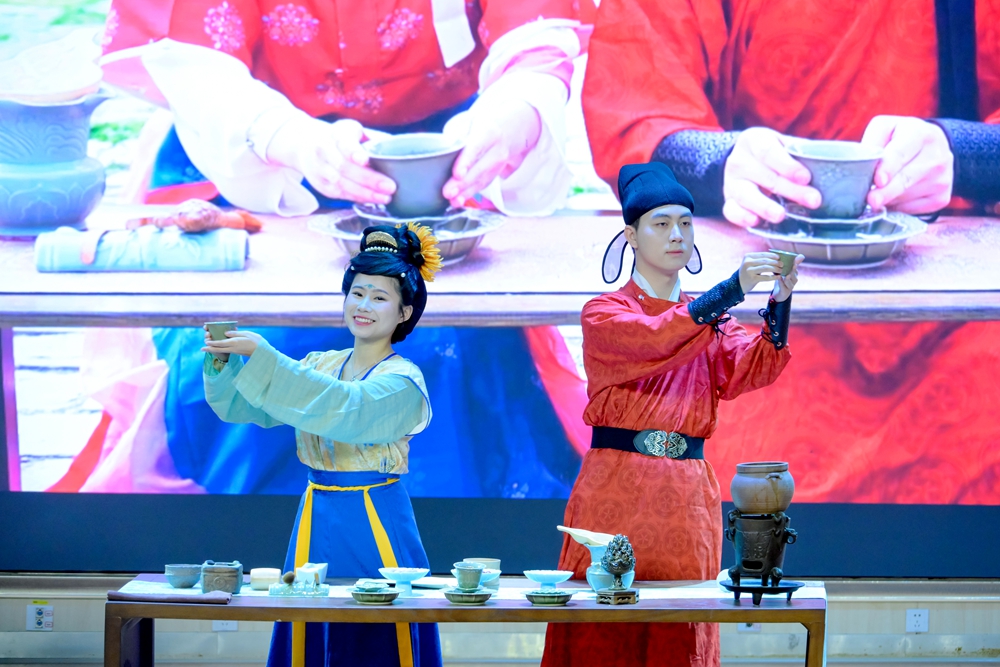 节目展演现场,掌声与欢呼声不绝于耳。艺术学院的诗词演唱《山之高》古韵悠扬、意境深远。十堰市图书馆创编的舞台剧《诗经·卫风·氓》,以现代视角演绎了古人的新婚恋观,引人深思。历史文化与旅游学院的茶艺表演《大唐煎茶——武当山茶的千年回响》,将朗诵与非遗茶文化巧妙结合,展现了武当山茶的文化传承。十堰市柳林小学的舞台剧《跟着课本去旅行》以灵动的舞蹈演绎语文经典,充满了浓郁的童真童趣。文学院的诗朗诵《何以华夏 何以中国》则带领大家穿越时空,领略了华夏文明的辉煌与厚重。