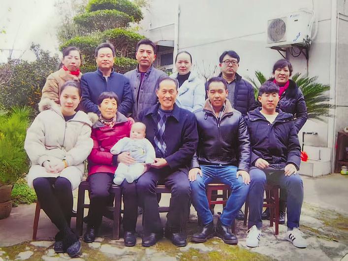 姚忠信(前排右二)、姚洪亮(后排左二)父子及家人