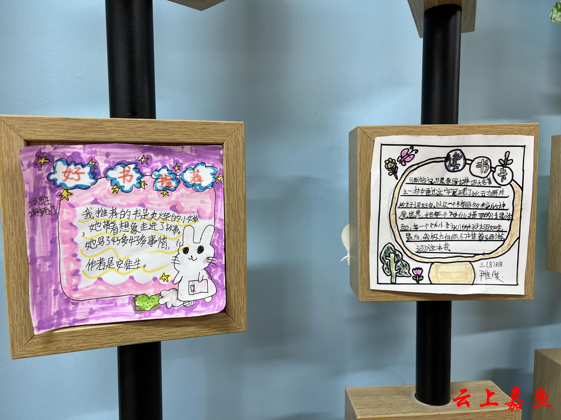 “《夏洛的网》让我哭湿了三张纸巾!威尔伯和蜘蛛的友谊比草莓冰淇淋还甜!”——歪歪扭扭的字迹旁画着吐丝的蜘蛛和笑脸小猪。偶尔能看到老师用红笔批注的爱心:“观察力+1分!”“这个比喻真棒!”阳光透过窗户洒在墙面上,那些用荧光笔写的字句正在闪闪发亮,仿佛整面墙都在呼吸着童真的想象力。