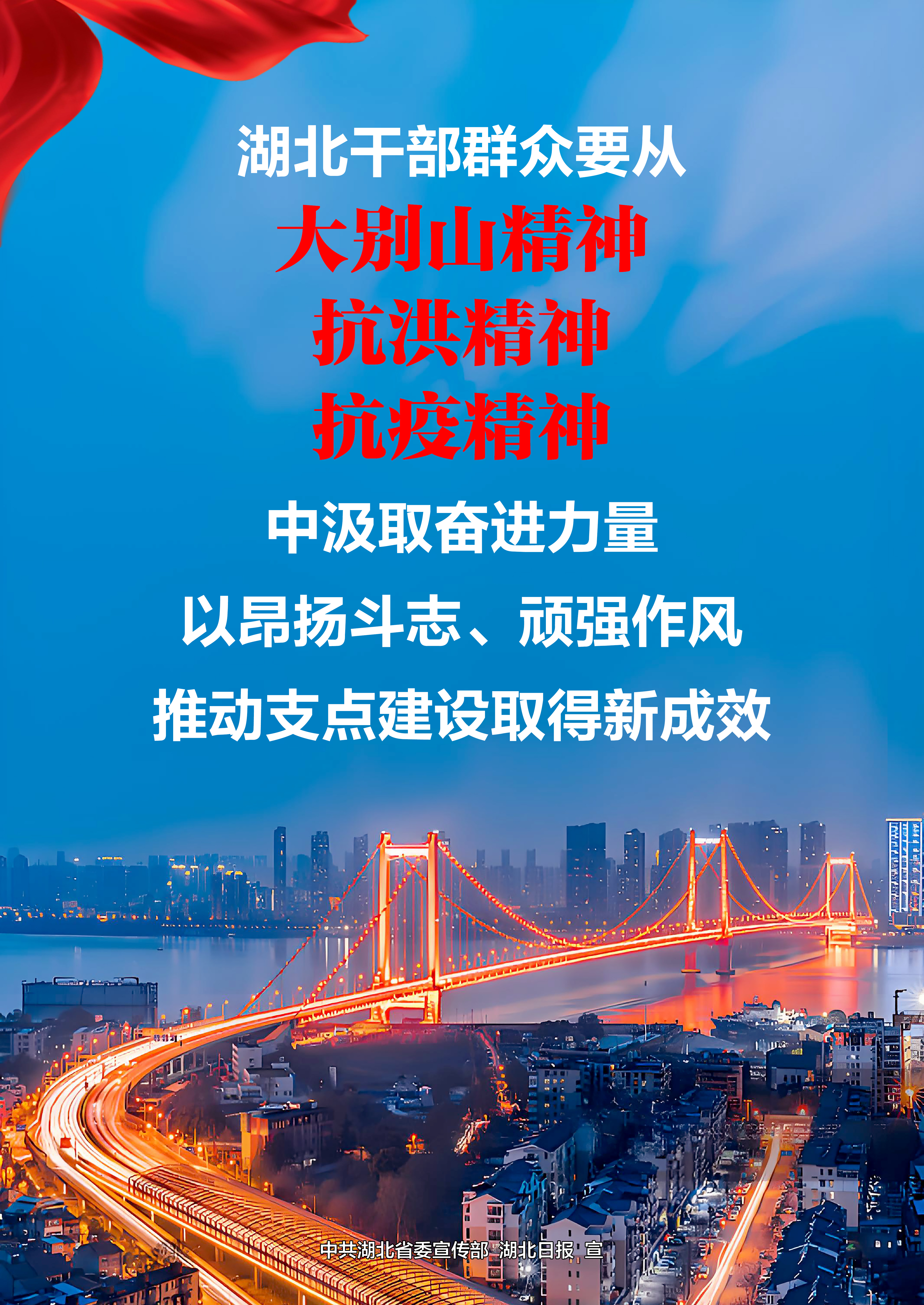 去年深秋,习近平总书记考察湖北时强调,大力弘扬大别山精神、抗洪精神、抗疫精神,广泛践行社会主义核心价值观。这为我们在长江经济带高质量发展中奋勇争先,加快建成中部地区崛起的重要战略支点,奋力谱写中国式现代化湖北篇章,指明了要充分汲取的动力源泉,要广泛汇聚的精神能量。