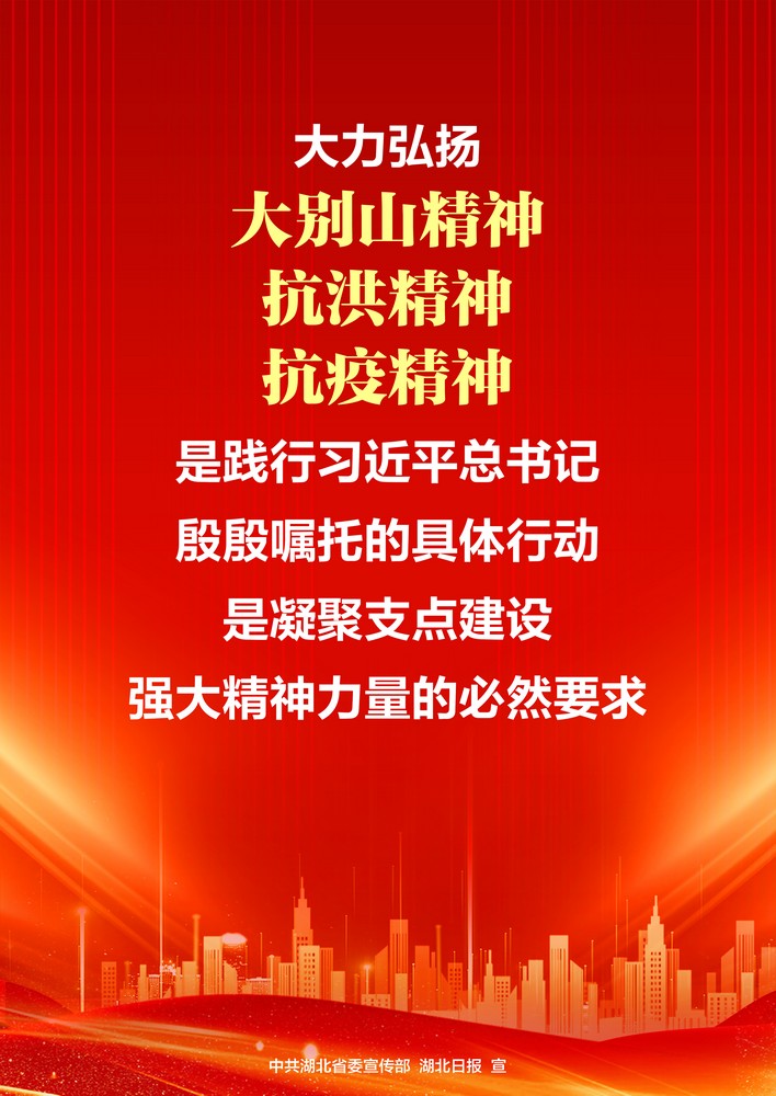 去年深秋,习近平总书记考察湖北时强调,大力弘扬大别山精神、抗洪精神、抗疫精神,广泛践行社会主义核心价值观。这为我们在长江经济带高质量发展中奋勇争先,加快建成中部地区崛起的重要战略支点,奋力谱写中国式现代化湖北篇章,指明了要充分汲取的动力源泉,要广泛汇聚的精神能量。