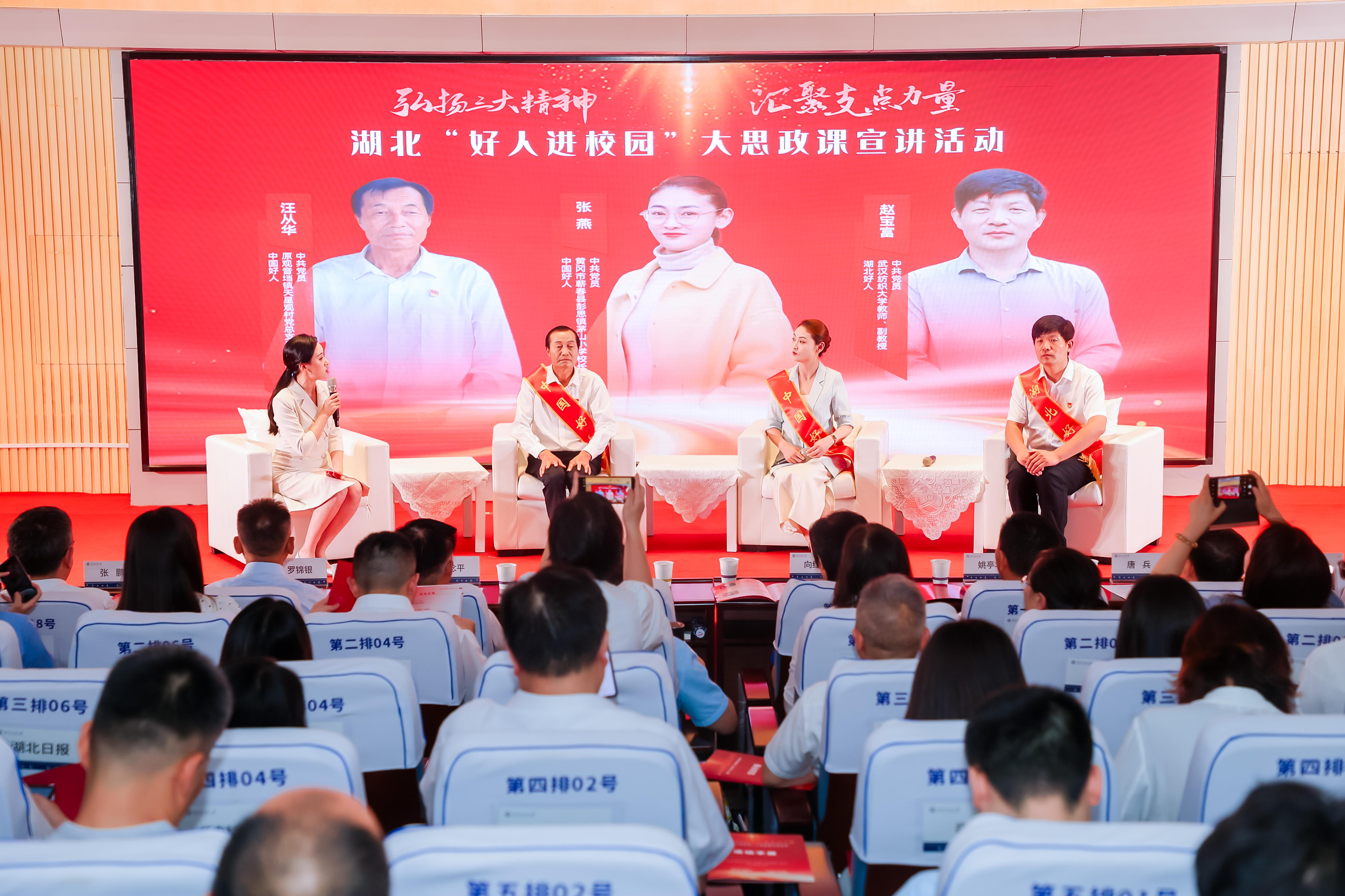 6月17日,由省委宣传部、省文明办、省委讲师团、省教育厅主办的“弘扬三大精神 汇聚支点力量”——湖北“好人进校园”大思政课宣讲活动,在武汉纺织大学阳光校区举行。活动现场发布2025年第一批“湖北好人”,同时启动新时代网络文明公益广告征集活动。