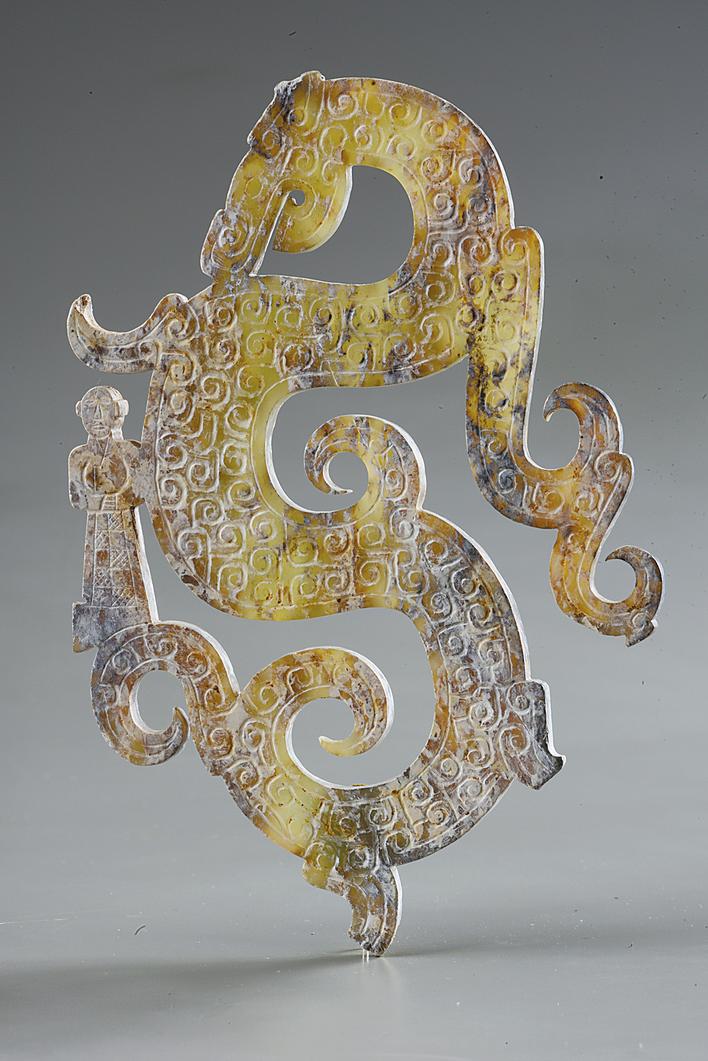 湖南长沙象鼻嘴墓出土的西汉透雕动物纹玉剑首,正中镶嵌一绿松石片,周围透雕出龙、凤、熊等动物造型环绕,浅浮雕出眼、鼻、耳、喙、爪等细节。构思巧妙、雕工精湛、纹饰繁复,是汉代长沙国的玉雕精品。