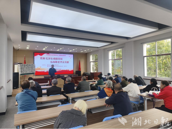 为传承红色文脉、弘扬敬老孝亲传统,近日,黄石市黄石港街道覆盆山社区联合湖北省老兵宣讲团成员黄开才开展“赏析毛泽东重阳诗词 弘扬敬老孝亲美德”主题活动,老兵宣讲团成员与30余名退役军人、青少年、党员代表共赏经典诗词。