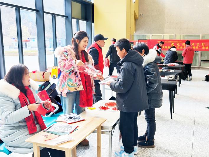 神农架站,艺术家向旅客赠送喜庆的剪纸作品。 (魏亚波 摄)