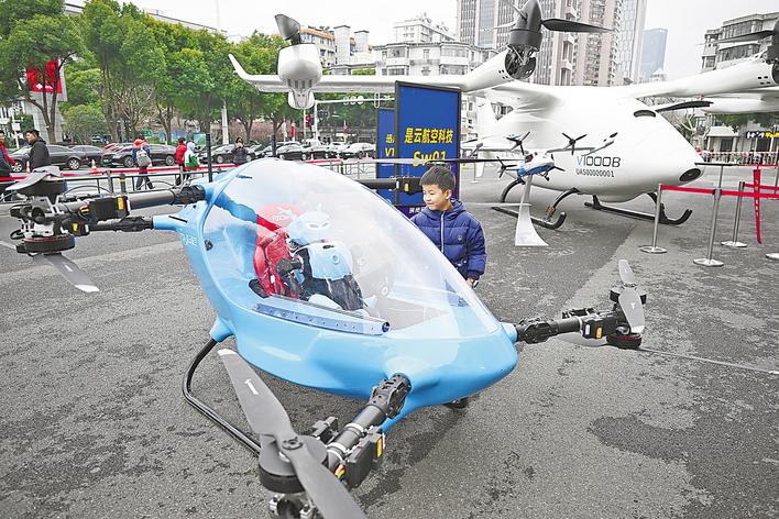 2月24日,湖北自主研制的多款eVTOL(电动垂直起降飞行器)航空器以及人形机器人亮相。(湖北日报全媒记者 陈少哲 摄)
