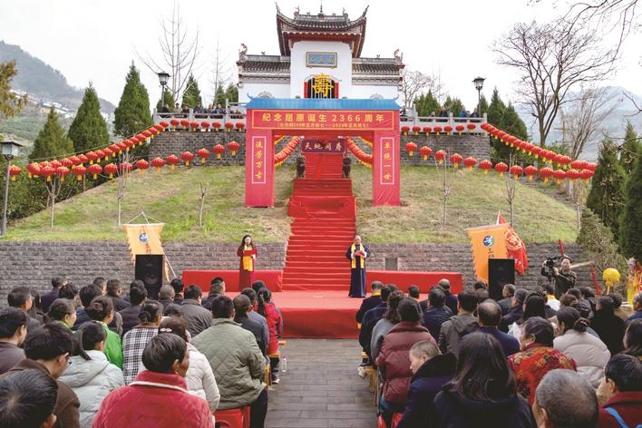 锣鼓喧天庆寿辰,诗韵悠扬忆先贤。2月23日,丙午年正月初七,恰逢伟大爱国诗人屈原诞辰2366周年,其诞生地——秭归县屈原镇屈原村,暖意融融、欢声阵阵。当地民众、屈氏后裔与八方宾朋齐聚屈原庙,以民俗巡游、传统拜寿、方言诗会等接地气的方式,缅怀诗祖风范,传承屈原文化。