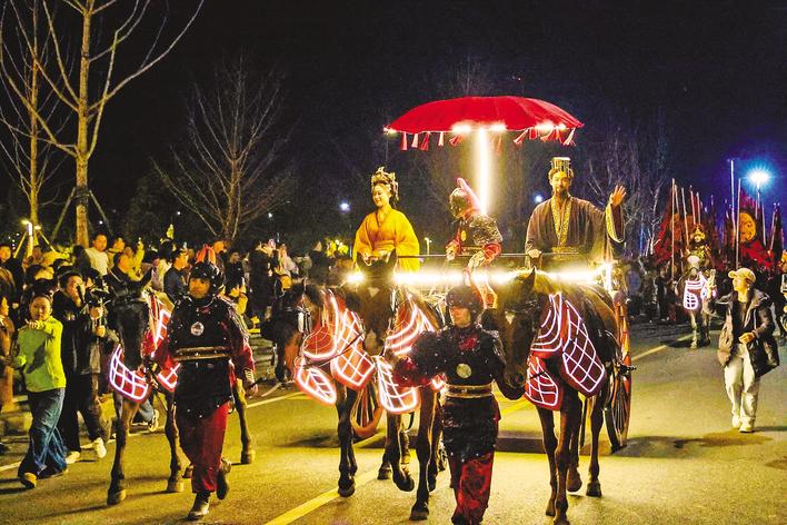 正月初五,怀信路两侧早已聚集大批翘首以盼的游客。随着一阵雄浑的号角声,“楚王巡游”大型实景演艺率先拉开帷幕。旌旗猎猎,马蹄声声,楚国车马仪仗的威严盛景穿越时空重现眼前。“楚王”乘坐四马御驾踏春而来,身后紧随着将军护卫、士兵仪仗及持灯楚女组成百人方阵。演员们邀约游客“同入郢都”,跟随着人流步入楚韵廊桥,游人仿佛一步千年,踏入战国楚地。来自湖南张家界的赵丽萍带着一家人在荆州游玩了3天,感触很深:“‘楚乐八百年’让孩子们亲身感受和学习到楚文化的魅力。”