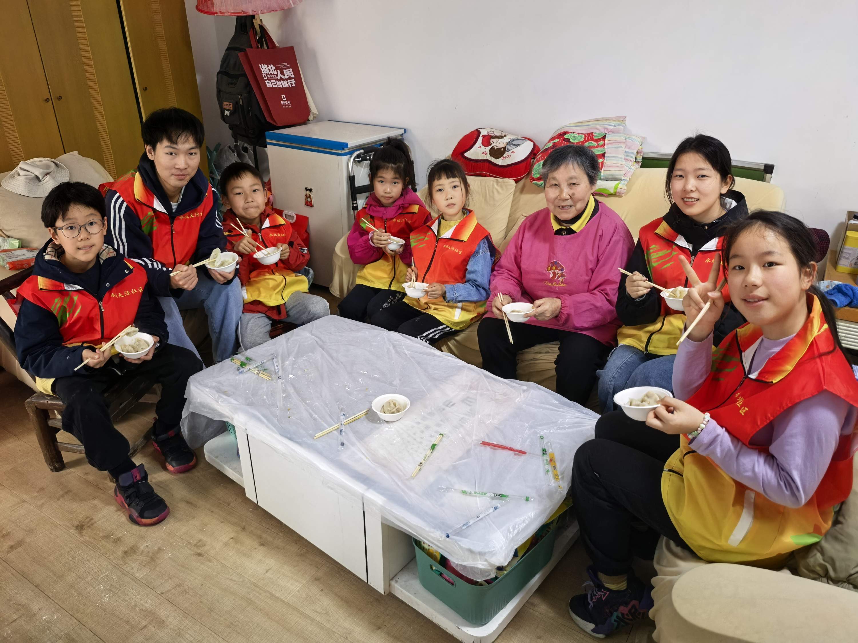 在昙华林的青石板路上,一群大学生骑着单车穿行而过,他们不是匆匆过客,而是向游客递上“低碳生活”邀请函的文明使者;在南湖街道水域天际社区的独居老人家中,“小水滴”们叩开房门,送上的不仅是亲手烘焙的点心,更是一份贴心的陪伴;在黄鹤楼下的“先蜂”驿站,外卖小哥趁着接单间隙测了血压,还与华科大的研究生们围坐在一起,过了一次特别的“政治生日”……
