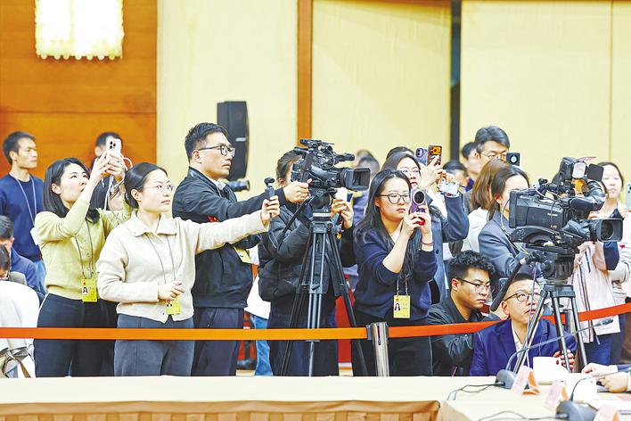 3月6日下午,十四届全国人大四次会议湖北代表团举行全体会议暨媒体开放日活动,审查“十五五”规划纲要草案,并向中外媒体全程开放。(湖北日报全媒记者 任勇 摄)