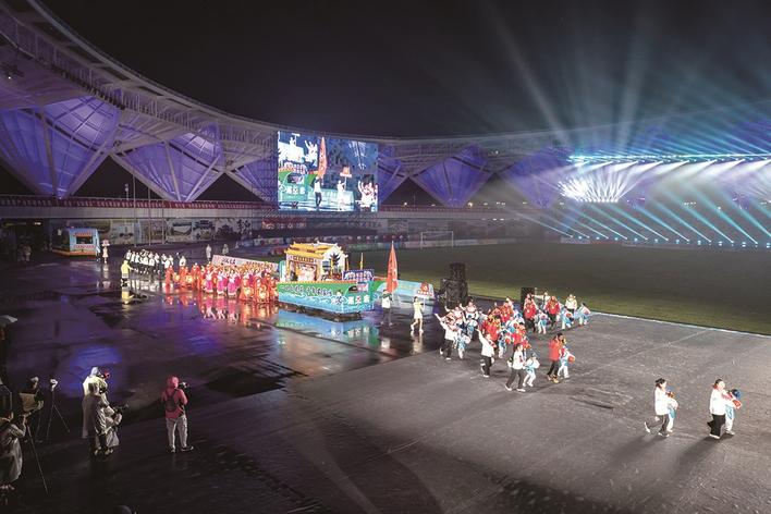 开幕式以三大篇章勾勒安陆新貌,将“诗酒趁年华”的豪迈与“敢闯敢拼”的绿茵热血完美融合。《乡超焕新》篇章里,大型团体操《龙马精神迎乡超》以灵动舞姿展现安陆活力,集体啦啦操《“蛋谷” 安陆》尽显本土风情;《奋进安陆》篇章中,16支乡镇代表队精神抖擞,将 “复兴德安、振兴安陆” 的担当写在绿茵场。