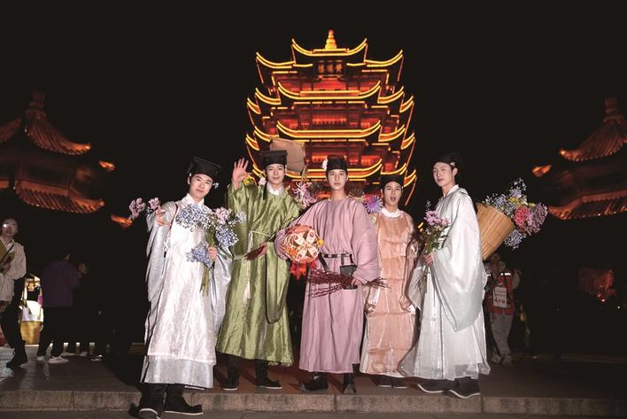 樱花季期间,园区还将推出多项沉浸式互动活动。“花神赐点妆”“诗仙解忧录”“仙子赐福来”等特色NPC互动将随机出现在夜游路线中,游客可与“花神”“李白”“黄鹤仙子”等角色邂逅,参与诗词互动与祈福打卡,收获一份别具特色的春日体验。此外,樱花季期间还将推出多场主题活动。开幕周将举行花朝盛典与舞龙巡游,第二周将上演传统汉婚礼仪展示,第三周则以“梅兰竹菊”四君子民乐合奏为游客呈现一场清雅悠远的国乐盛宴,让传统文化在名楼之上焕发新的生机。