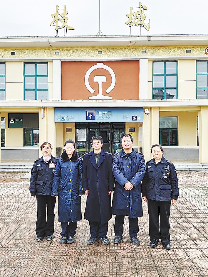 枝城站客运5人组,左起分别是:张艳(安检员),贾乙(客运员),王洪志(客运员),陈俊逸(客运员),何绍芹(安检员)。(受访者供图)